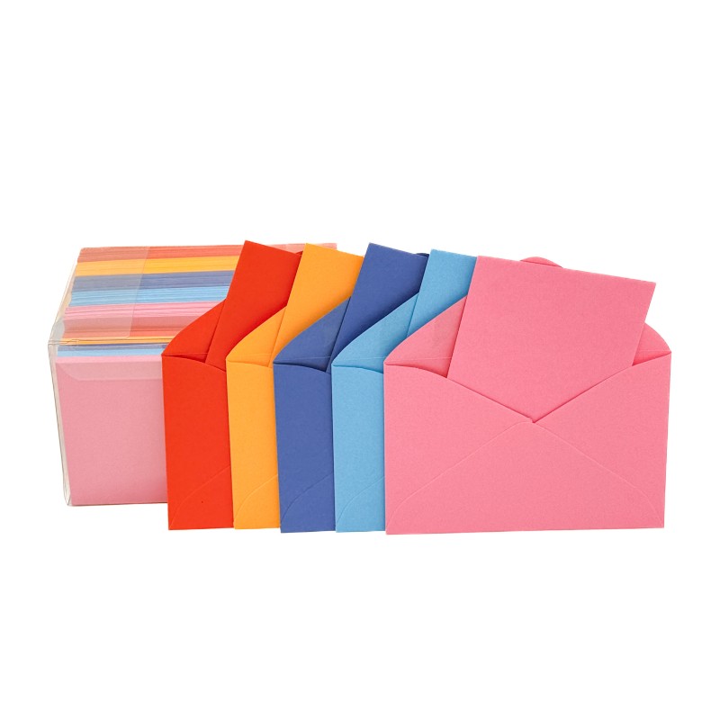 Biglietti f.to 4 (cm 7,5x11,2) assortiti in 5 colori, lembo gommato, cofanetto 100 biglietti + 100 buste.