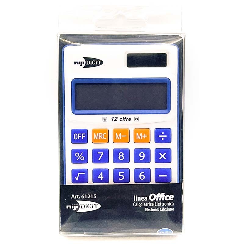 Calcolatrice elettronica tascabile a 12 cifre, misure cm. 6,5 x 11. Tasti in gomma, doppia alimentazione (solare e batteria). Coperchio protettivo, radice quadrata, memorie e percentuale.