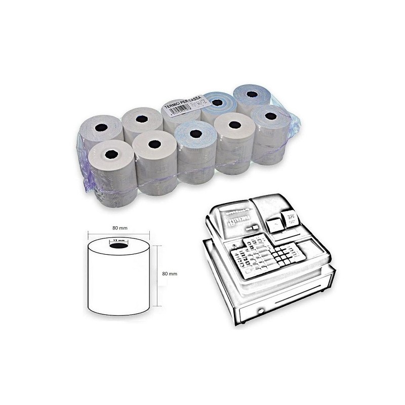 Utilizzabili nel registratore di cassa. Omologati. 80mm x 80m. Foro 12 mm.